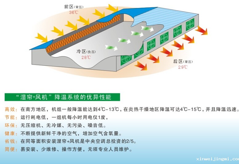 负压通风降温系统是利用风机与水帘的配合,人为的再现自然界水份蒸发降温这一物理过程,耗电量只是传统空调的十分之一。